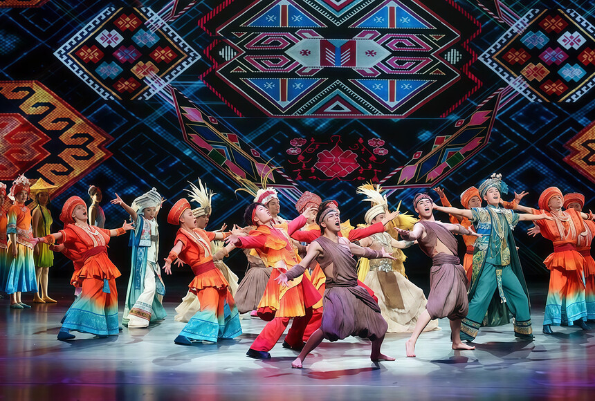 恩施大劇院,《西蘭卡普》舞臺(tái)劇帶來(lái)了令人驚嘆的舞臺(tái)效果。全包裹影像覆蓋舞臺(tái),結(jié)合土家族傳統(tǒng)建筑元素構(gòu)建的吊腳樓群,配合立體投影和新媒體技術(shù),打造出民族特色與現(xiàn)代感兼具的空間。演出中,三層吊裝冰屏、背景可開(kāi)合 LED 大屏以及超高升降平臺(tái)聯(lián)動(dòng),影像與真實(shí)舞臺(tái)相互疊加。如第四篇章,裝置和光影特效烘托出西蘭月中之舞的視覺(jué)奇觀,精心設(shè)計(jì)的兩層舞臺(tái)空間交織,帶來(lái)極致視覺(jué)張力,讓觀眾仿若置身于土家的傳奇故事中,感受其獨(dú)特魅力 。