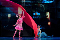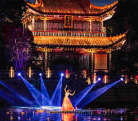 以天臺山千年古韻為底色,通過虛實結合的舞臺科技,再現江南水鄉的市井煙火與詩意棲居。舞臺以赭溪河道為中軸,蜿蜒的石橋、錯落的木構民居與流動的水景裝置構成立體空間,配合全息投影與霧森系統,營造晨曦薄霧、漁火搖曳的靈動意境。 機械軌道控制的烏篷船載著戲曲演員緩緩駛過,兩岸店鋪的仿古門窗可動態開合,展現打鐵、釀酒等非遺技藝的微劇場。穹頂懸掛的仿古燈籠陣列隨音樂變幻光影,地面互動投影讓觀眾腳步泛起“水波紋”。當夜幕降臨,3D Mapping技術將古建筑立面化作動態畫卷,演繹天臺山傳說與唐詩意境,最終以漫天孔明燈升騰的震撼視效,完成一場穿越千年的赭溪幻夢。